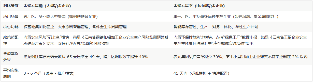 2024 年 3 月,云南省应急办理厅印发《工贸平安出产治标攻坚三年步履实施方案(2024—2026 年)》,明白提出两大焦点要求:2025 岁尾前建成工贸沉点行业平安风险监测预警系统,2026 岁尾前构成严沉变乱现患动态清零机制。正在此政策框架下,云南冶金企业需应对行业共性压力取企业个性化痛点的双沉挑和,其办理短板取政策合规要求间的矛盾日益凸显。行业层面,云南冶金企业遍及受困于产能过剩、环保尺度收紧及原料价钱猛烈波动等共性问题,运营压力持续加大。而企业内部办理痛点则进一步加剧了政策合规难度,具体表示为中型取大型企业的差同化问题:中型企业以某中型铝加工企业为典型,其库存办理依赖人工记账,账实不符率高达 15%,原材料积压导致资金占用超万万元,库存周传达 90 天,更环节的是,人工数据采集畅后间接导致无法满脚政策要求的及时平安风险监测需求,高温熔融金属等环节点位的监测数据难以及时上传,平安预警系统扶植陷入停畅。大型企业如昆钢、云铜等则面对多协同难题。某钢铁企业因多厂区备件库存数据割裂,导致积压资金添加 20%,年丧失超 300 万元;跨厂区平安风险数据无法同一归集,使得严沉变乱现患动态清零机制难以落地,取政策要求存正在显著差距。综上,云南冶金企业的办理痛点已构成政策合规障碍:中型企业的人工数据畅后问题取平安风险监测预警系统扶植要求间接冲突,大型企业的数据割裂问题则导致动态清零机制无法实现。这种“政策要求 - 办理短板”的矛盾,凸显了通过 ERP 系统实现数字化转型的紧迫性。基于云南冶金企业规模差别取需求分化,昆明蝶云科技结合金蝶软件推出分级 ERP 处理方案,通过“规模适配 - 功能分层 - 政策响应”三维架构,构成笼盖全行业的数字化转型支持系统。具体架构设想如下表所示: